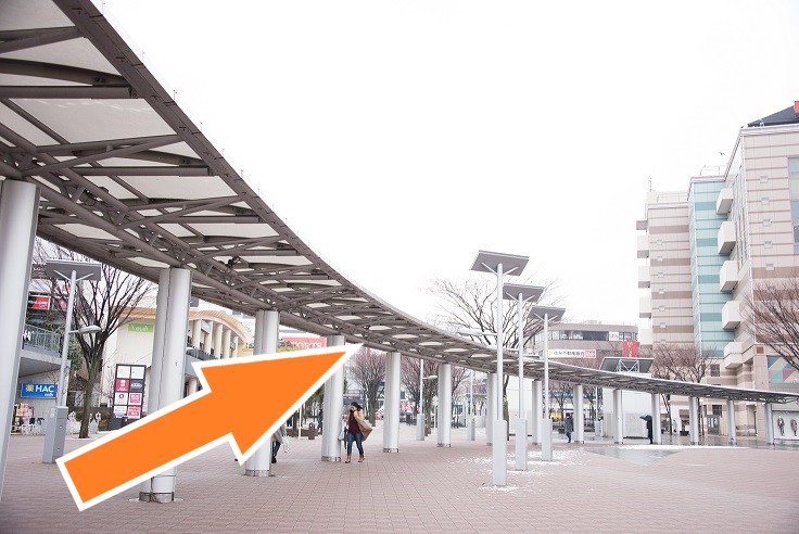 構内から外に出ると、港北東急に続く屋根付き通路があります。突っ切るように直進してください。