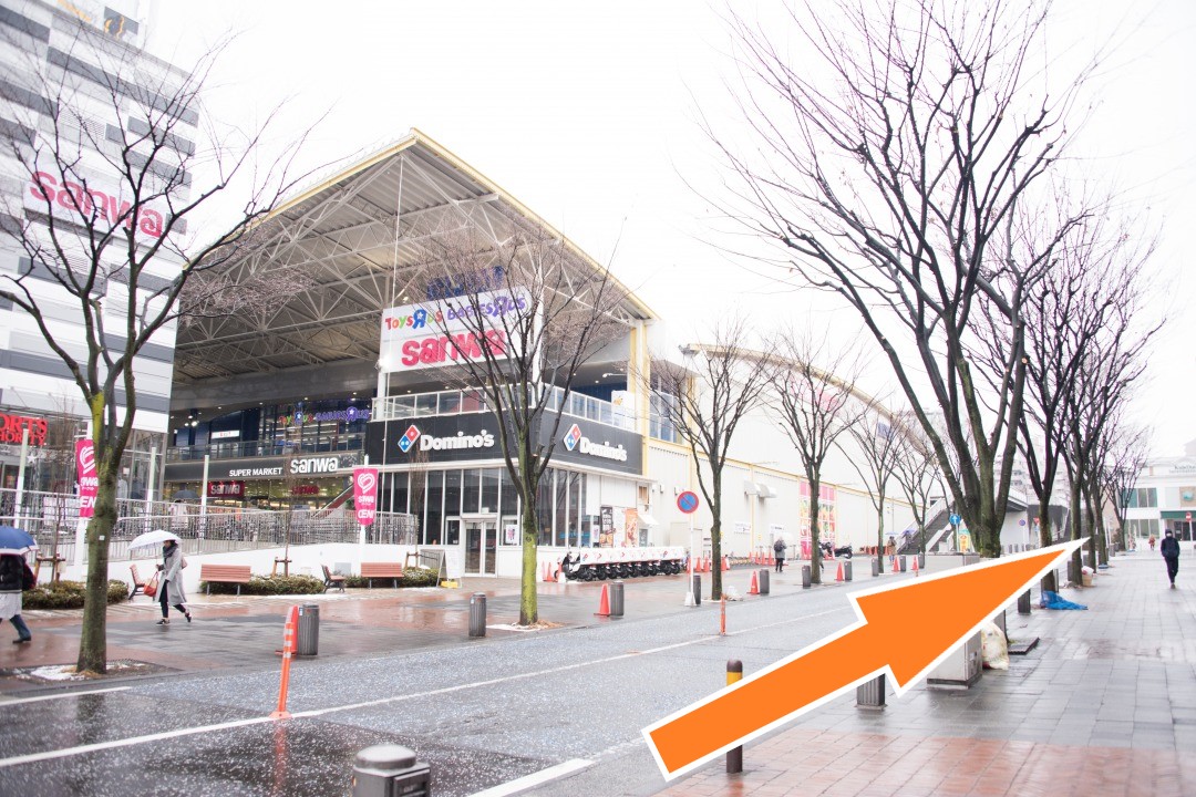 右の並びにメガネスーパー港北N.T.センター南店、左の並びにはキーサウルショッピングセンター(スポーツオーソリティ―、トイザらス、SANWA)があります。 右のメガネスーパー側を歩いて直進してください。